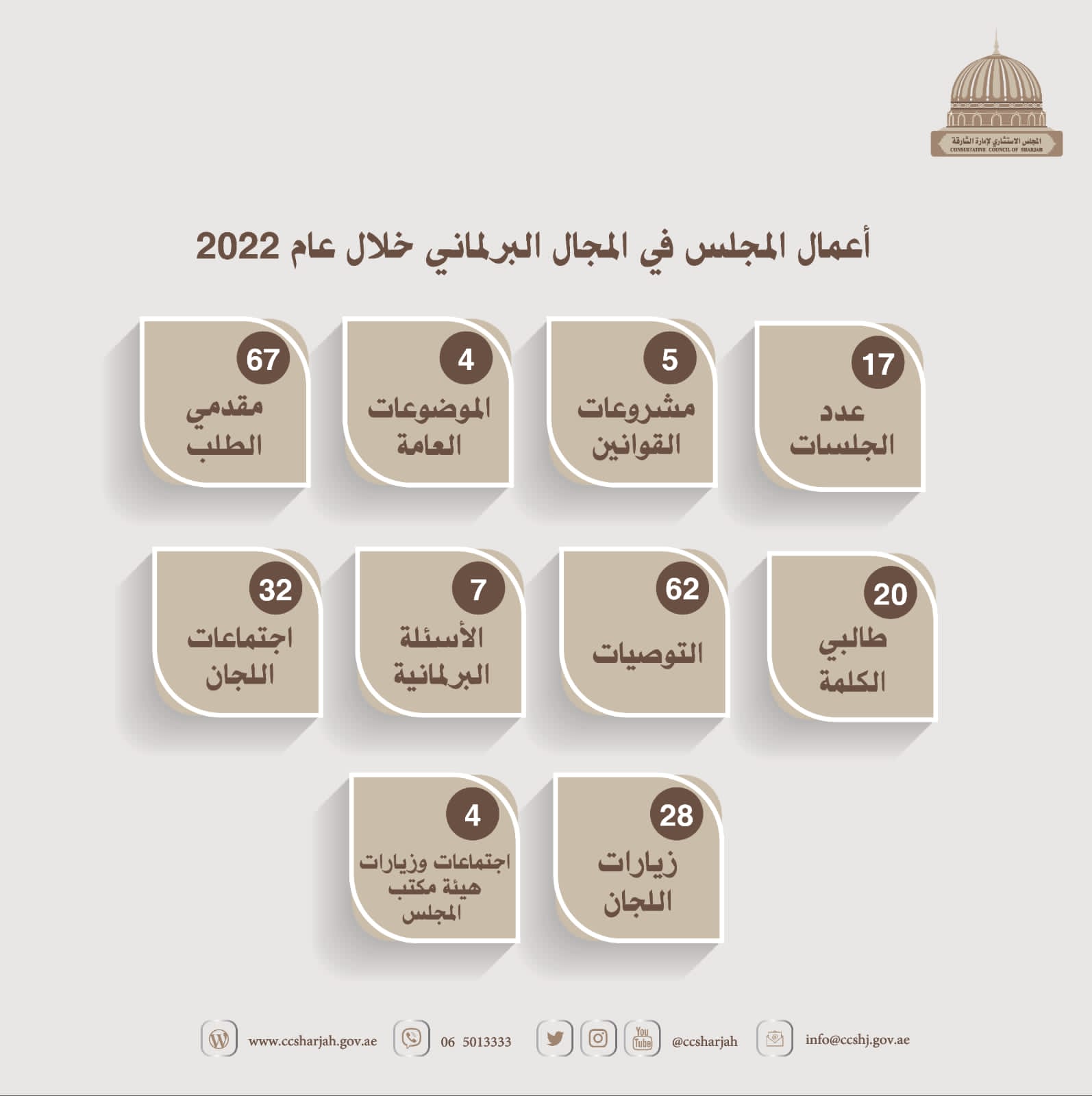 المجلس الاستشاري لإمارة الشارقة يصدر إحصائية أعماله في عام 2022م وهدفها أن يكون صوت المواطن بعقد 17 جلسة عامة وإصداره 62 توصية للحكومة