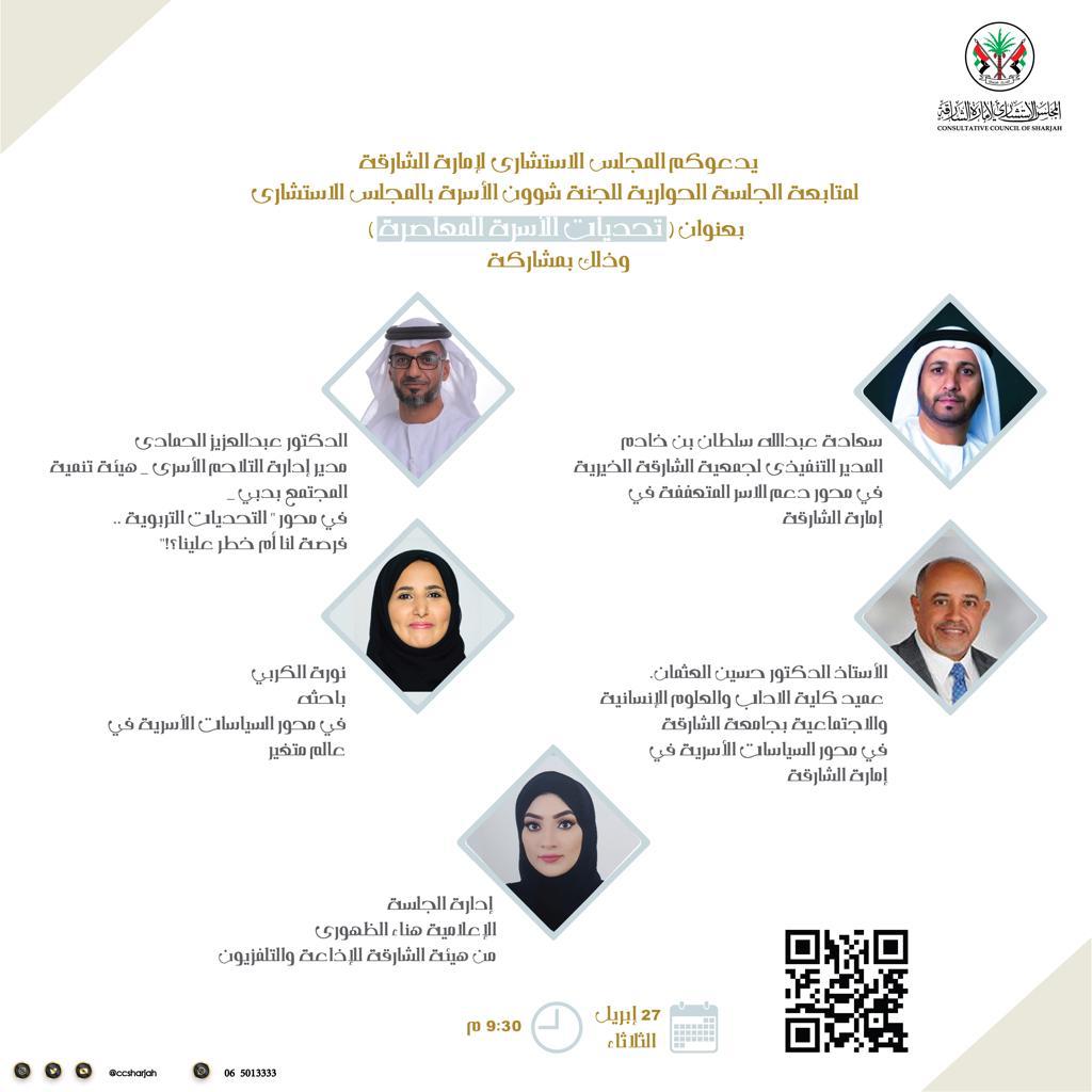 لجنة شؤون الأسرة بالمجلس الاستشاري لإمارة الشارقة تنظم جلسة حوارية عن بعد حول "تحديات الأسرة المعاصرة" وذلك يوم الثلاثاء، وتدعو المجتمع للحضور